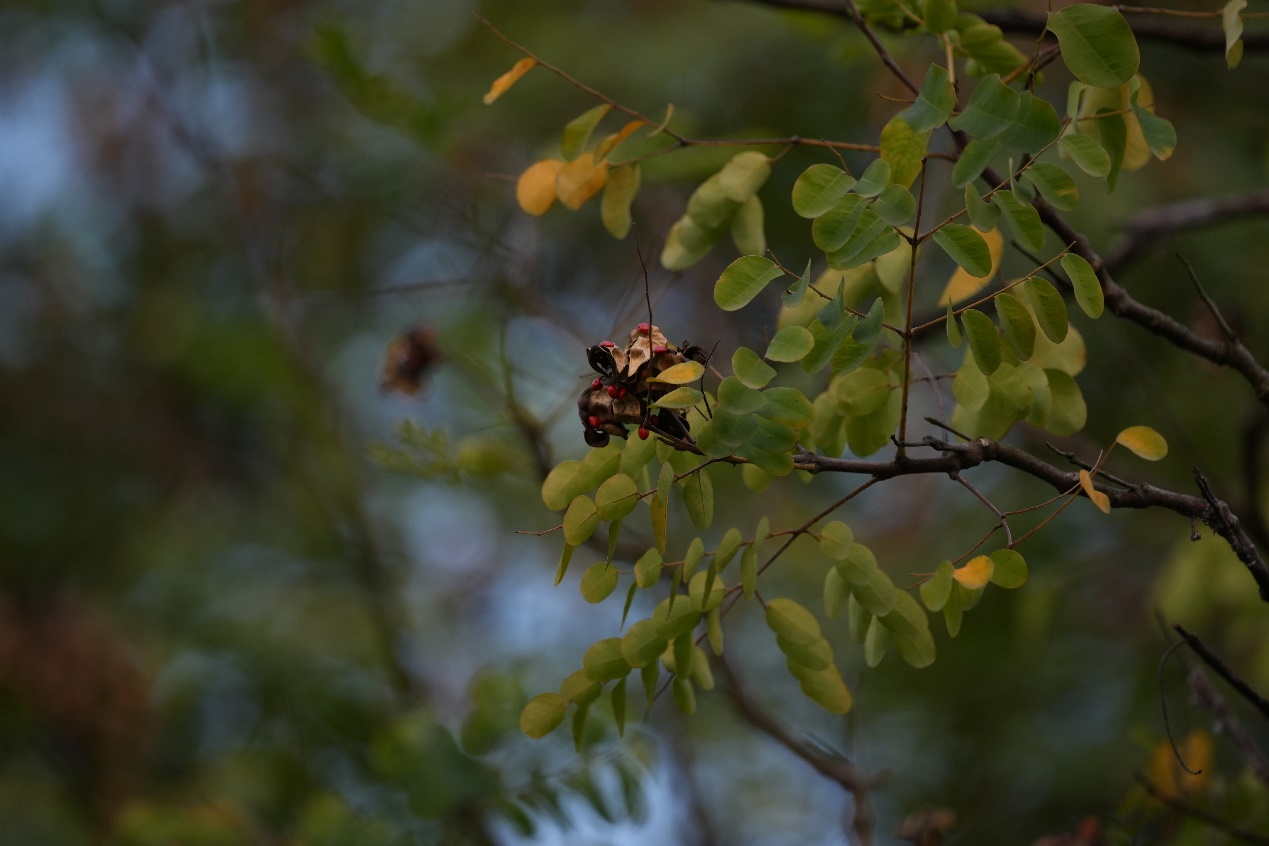 荚果成熟开裂后果瓣旋卷,部分种子迟落